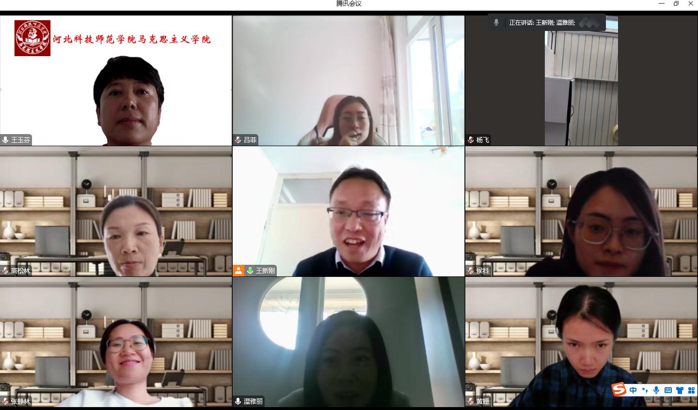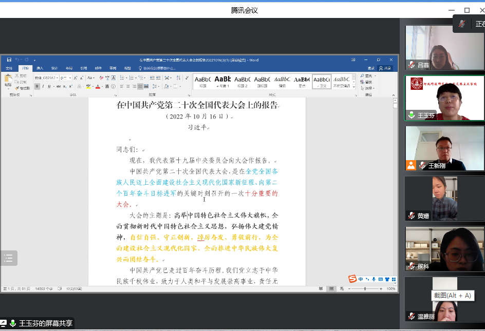 为学习贯彻党的二十大精神,坚持不懈以习近平新时代中国特色社会主义思想铸魂育人,2022年10月19日,“习近平新时代中国特色社会主义思想概论”党支部(以下简称新思想党支部)开展了学习党的二十大精神研读活动。会议由支部书记王新刚主持,支部全体党员参加。