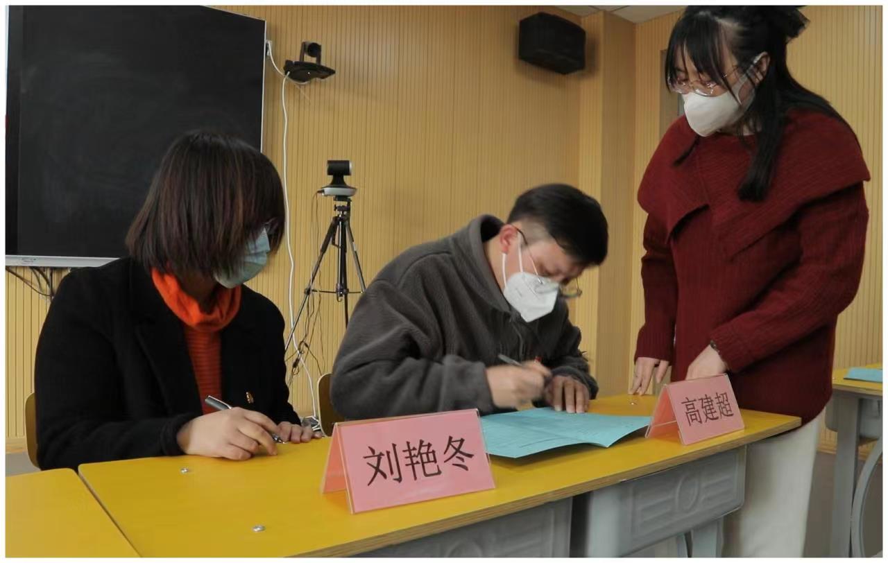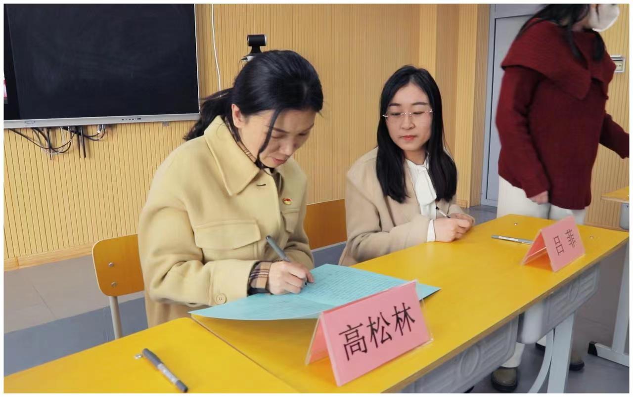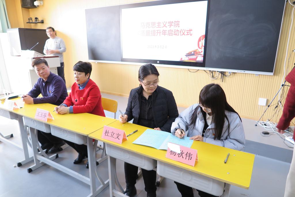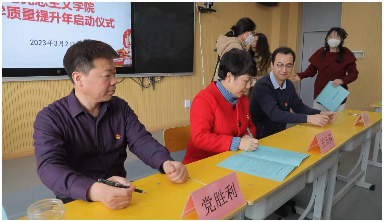 会上,王玉芬院长宣读了《今年会jinnian官网2023年思政课教学质量提升年工作实施方案》,宣布学院将2023年确定为“思政课教学质量提升年”(简称“质量年”),并通过开展8大项、22个小项具体工作提升思政课讲授质量和水平。曹凤珍、高建超两位老师分别代表教学部主任和全体教师针对“质量年”工作实施方案,从教学部管理、落实各项举措和提高教师教学、教研能力等方面作了发言。随后,党胜利书记宣读了《今年会jinnian官网党委关于开展“践行六点要求,做优秀思政课教师”专题教育实践活动的实施方案》。教师代表孙雅男宣读了《今年会jinnian官网师德师风自律承诺书》,学院党政负责人分别与各教学部(中心)主任、教师代表现场签署了承诺书。最后,党胜利书记就认真落实“质量年”工作实施方案,加强今年会jinnian官网基层党建和思政课改革创新提出了5点要求:一是突出政治属性,站稳教育立场;二是重视能力素养,提升教学质量;三是加强守德修身,守住师德底线;四是强化支部建设,建强战斗堡垒;五是践行团结奋斗,开创崭新业绩。