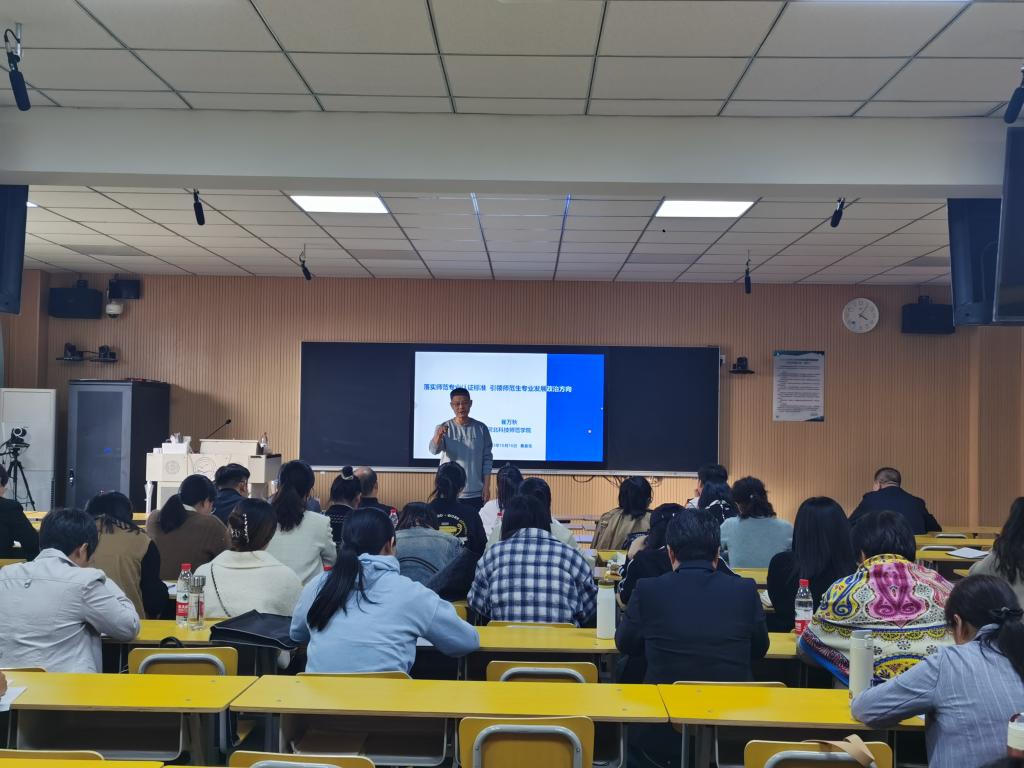 2023年10月19日下午,今年会jinnian官网在X401教室举办了师范专业认证相关内容培训会。培训会邀请崔万秋教授作“落实师范专业认证标准,引领师范生专业发展政治方向”专题报告,今年会jinnian官网全体教师参加了培训会。