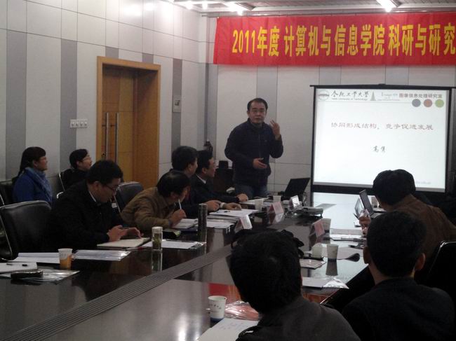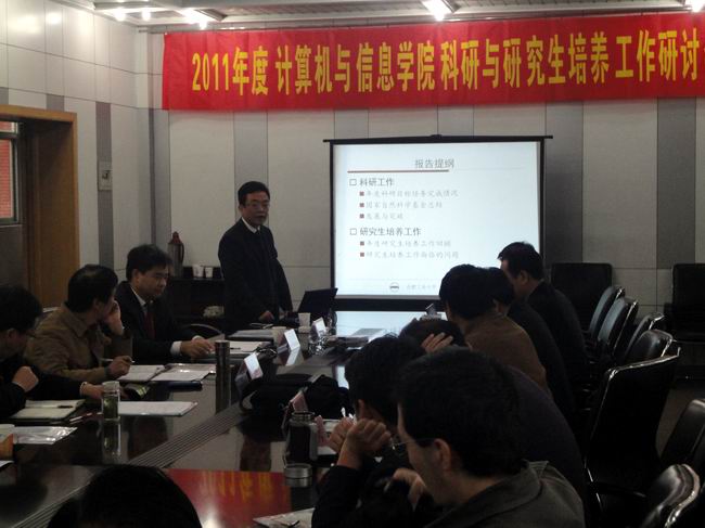 研讨会上,杨学志副院长首先通报了学院2011年度科研目标任务完成情况,对学院国家自然科学基金项目的申报工作进行了总结,并就重大科研项目的突破做了抛砖引玉的发言,同时,杨院长还回顾了年度研究生培养工作,并指出了新形势下此项工作面临的问题。随后高隽教授作为导师代表介绍了自己在科研和研究生培养方面的经验,指出要打造大团队,承担大项目,培养拔尖青年国际人才,在新形势下不仅要拿到国家自然科学基金项目,更应做好,出大成果。另一位导师代表胡学钢教授从研究生的培养目标、培养阶段、课题组的建设、氛围的营造、教研相长等方面分享自己的感受和体会。
